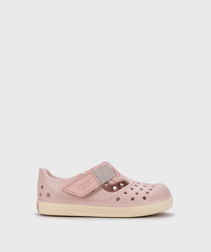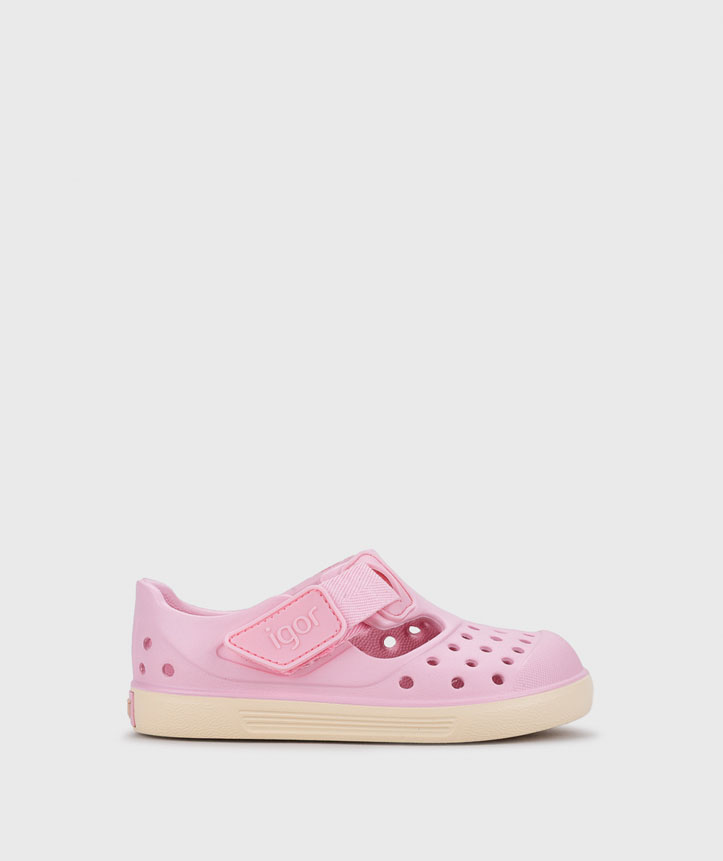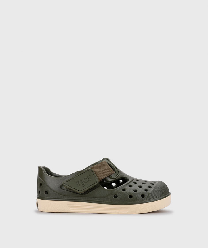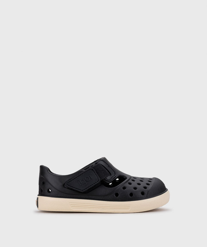 Sandália em EVA super leve e bicolor, desenhada no conceito barefoot medium, com drop zero, flexível, macia e fecho aderente.