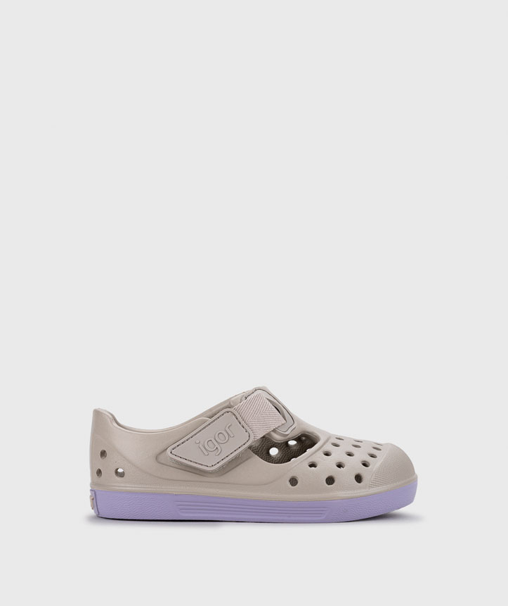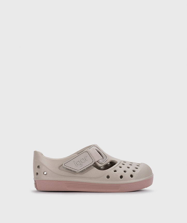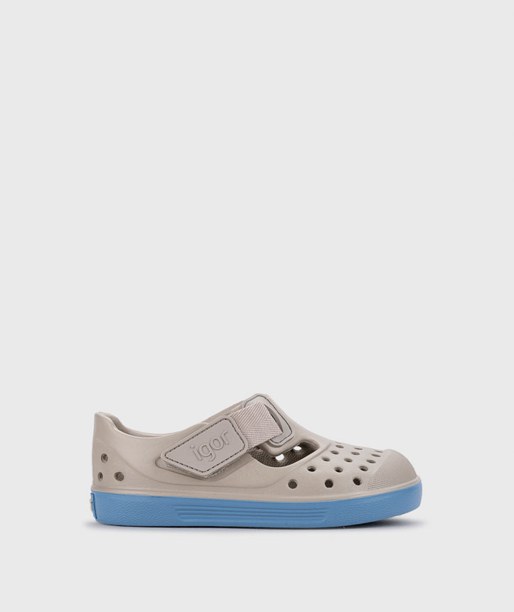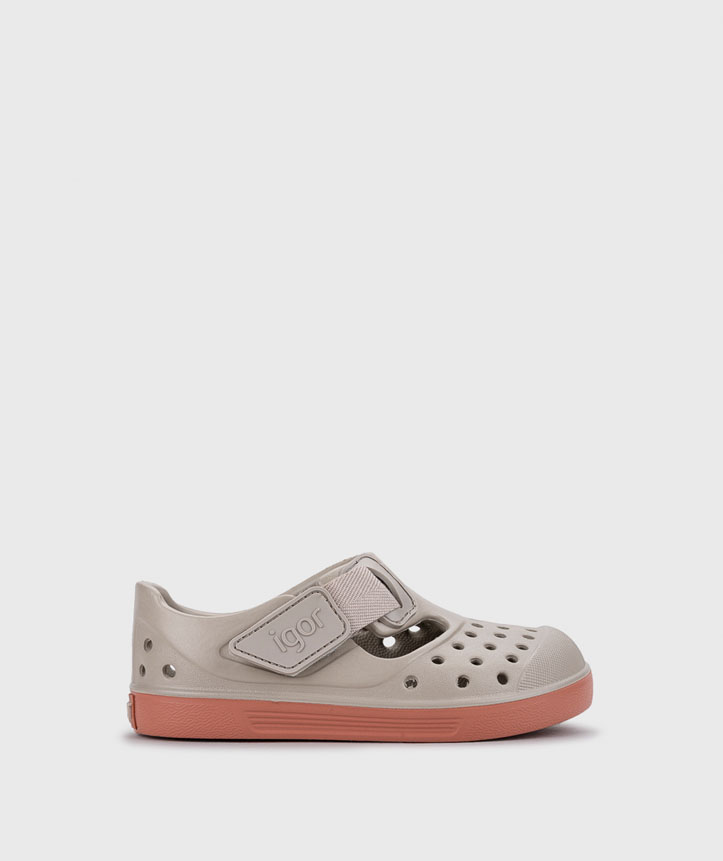 Sandália em EVA super leve e bicolor, desenhada no conceito barefoot medium, com drop zero, flexível, macia e fecho aderente.